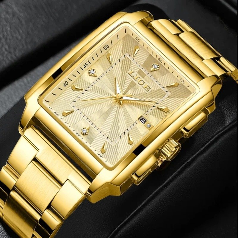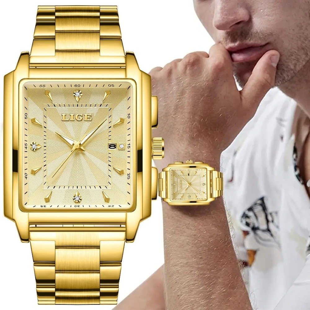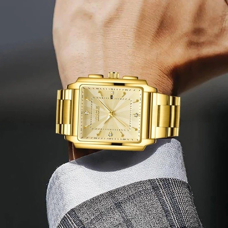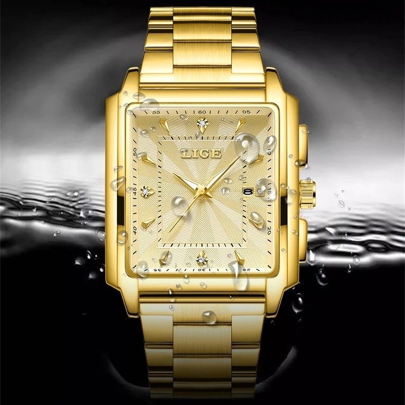 LIGE-89121 Men's Square Stainless Steel Gold Quartz Waterproof Wristwatch