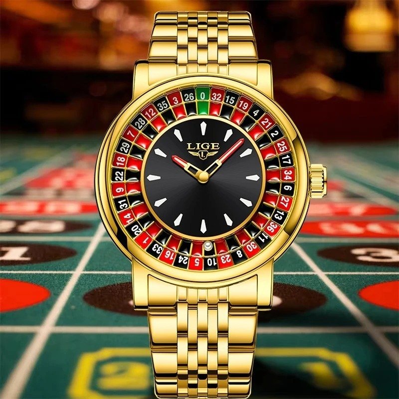 LIGE 89161 Stainless Steel Quartz Watches Stainless Band Gambling Series Rotating Dial Watch