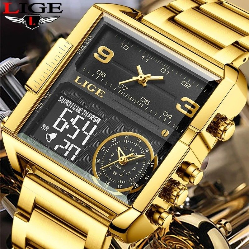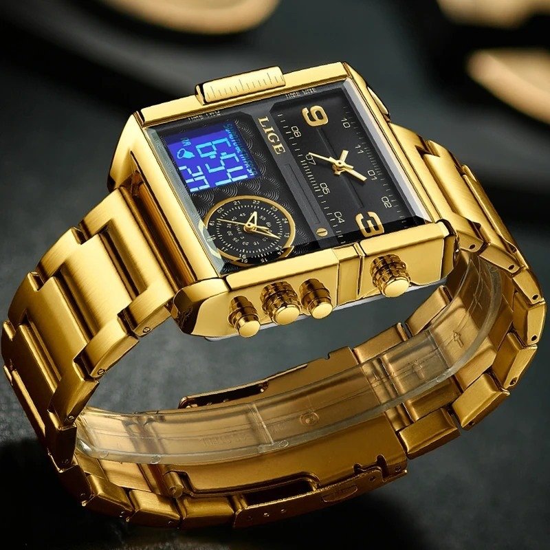 LIGE-8925 Golden Black Men's Luxury Dual Display Watch