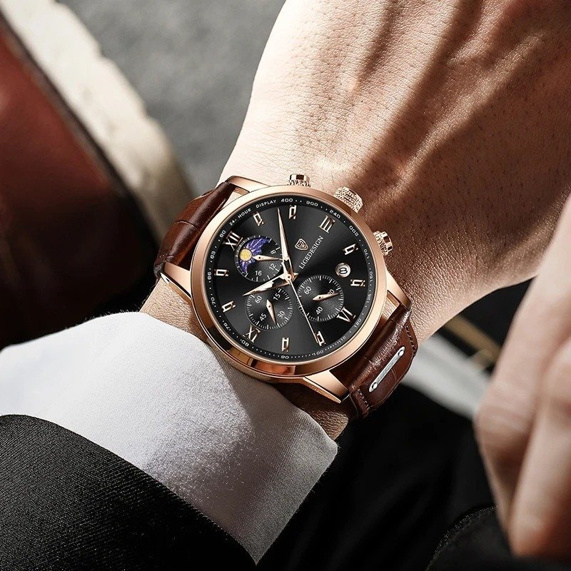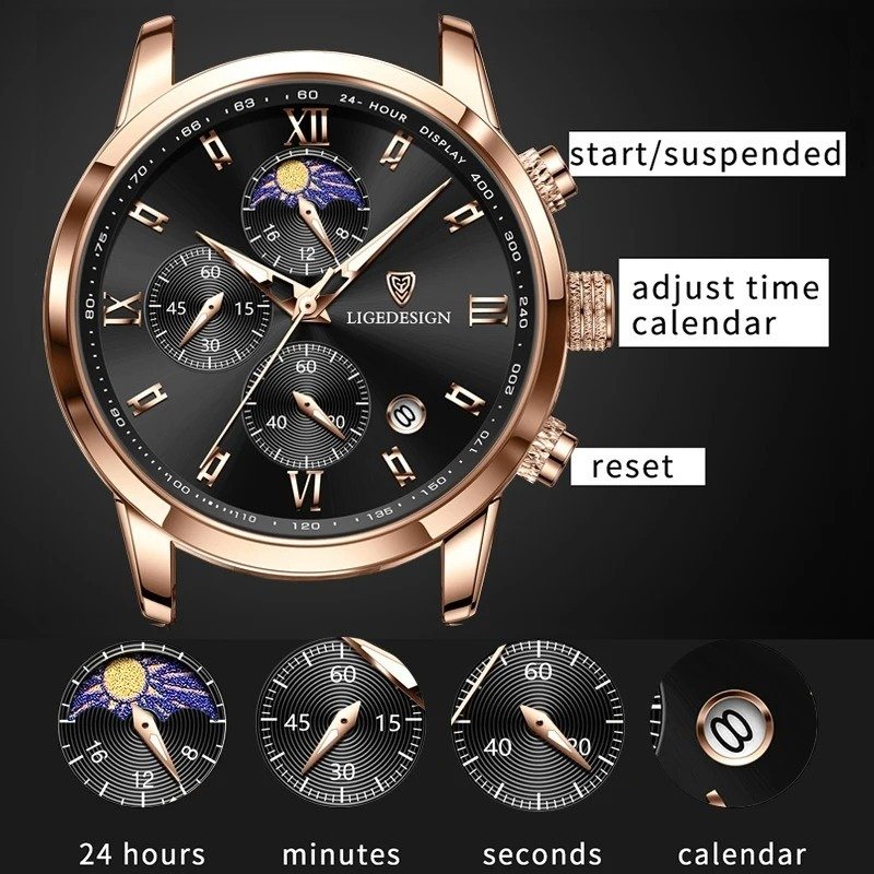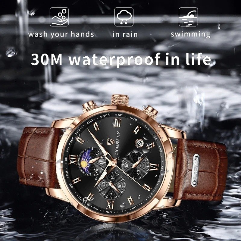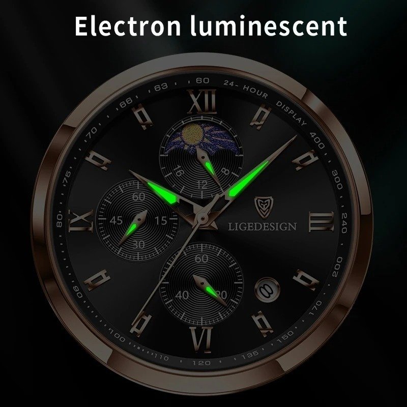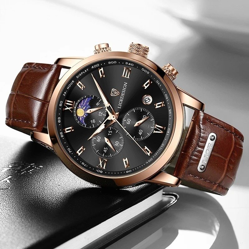 LIGE new mink watch. Gold-white dial. This is a stylish business and leisure clock. It has functions such as timekeeping, automatic calendar, waterproof, shockproof, luminous, 24-hour Moon phase; suitable for all occasions.