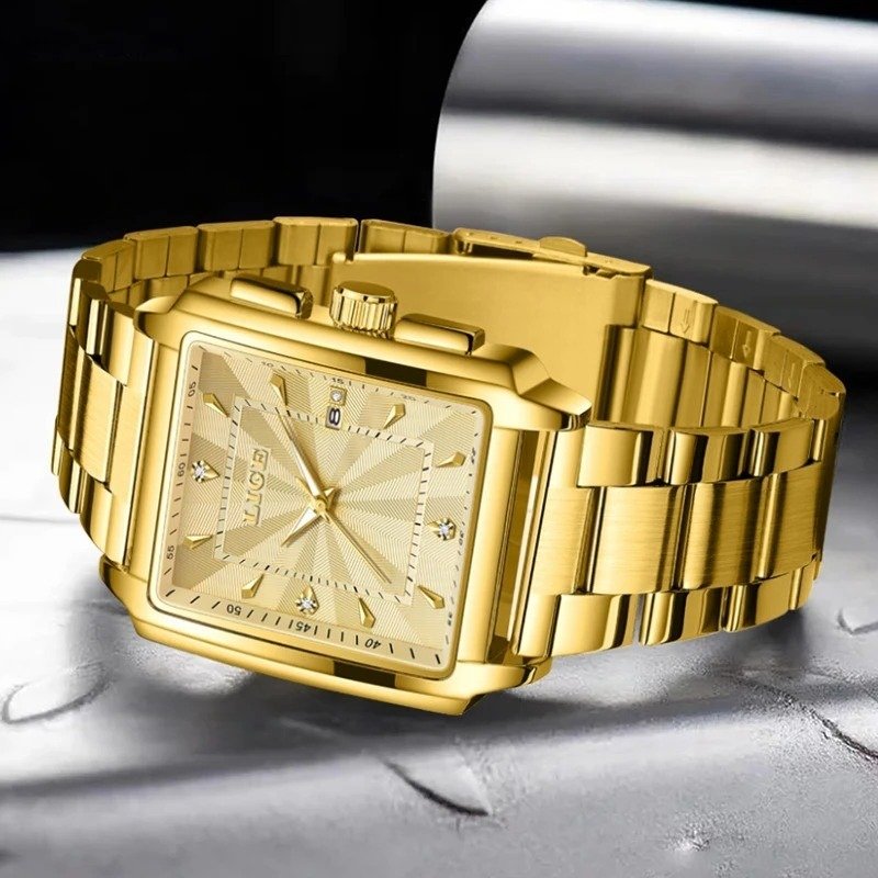 LIGE-89121 Men's Square Stainless Steel Gold Quartz Waterproof Wristwatch