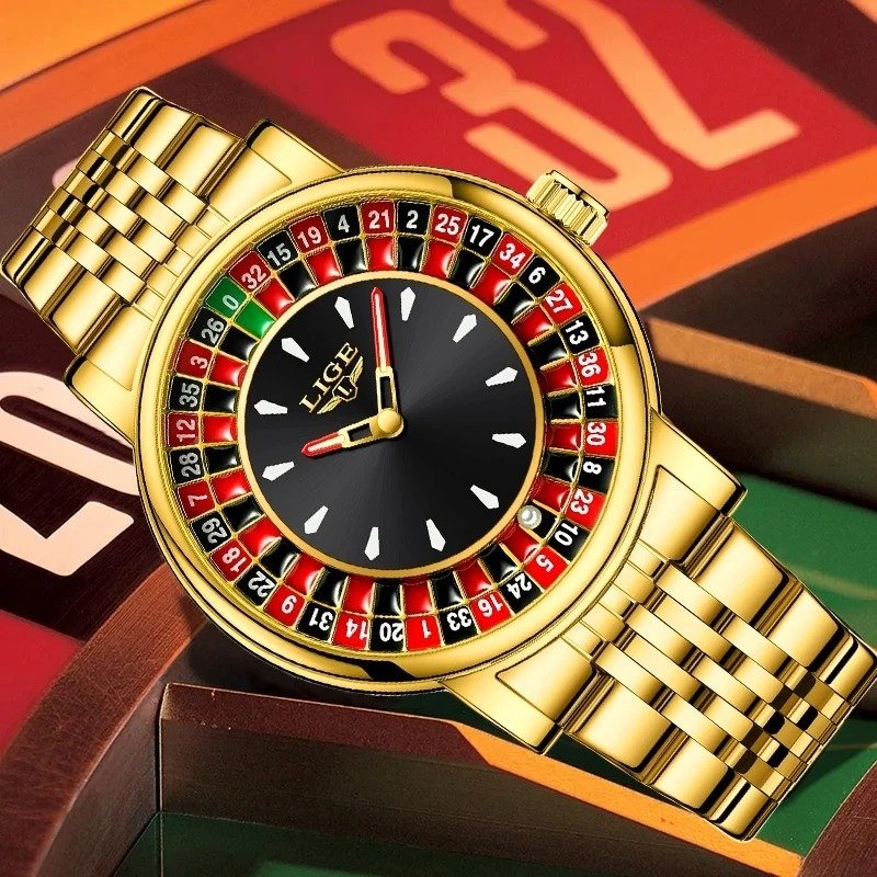 LIGE 89161 Stainless Steel Quartz Watches Stainless Band Gambling Series Rotating Dial Watch