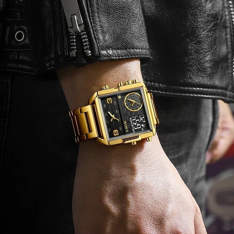 LIGE-8925 Golden Black Men's Luxury Dual Display Watch